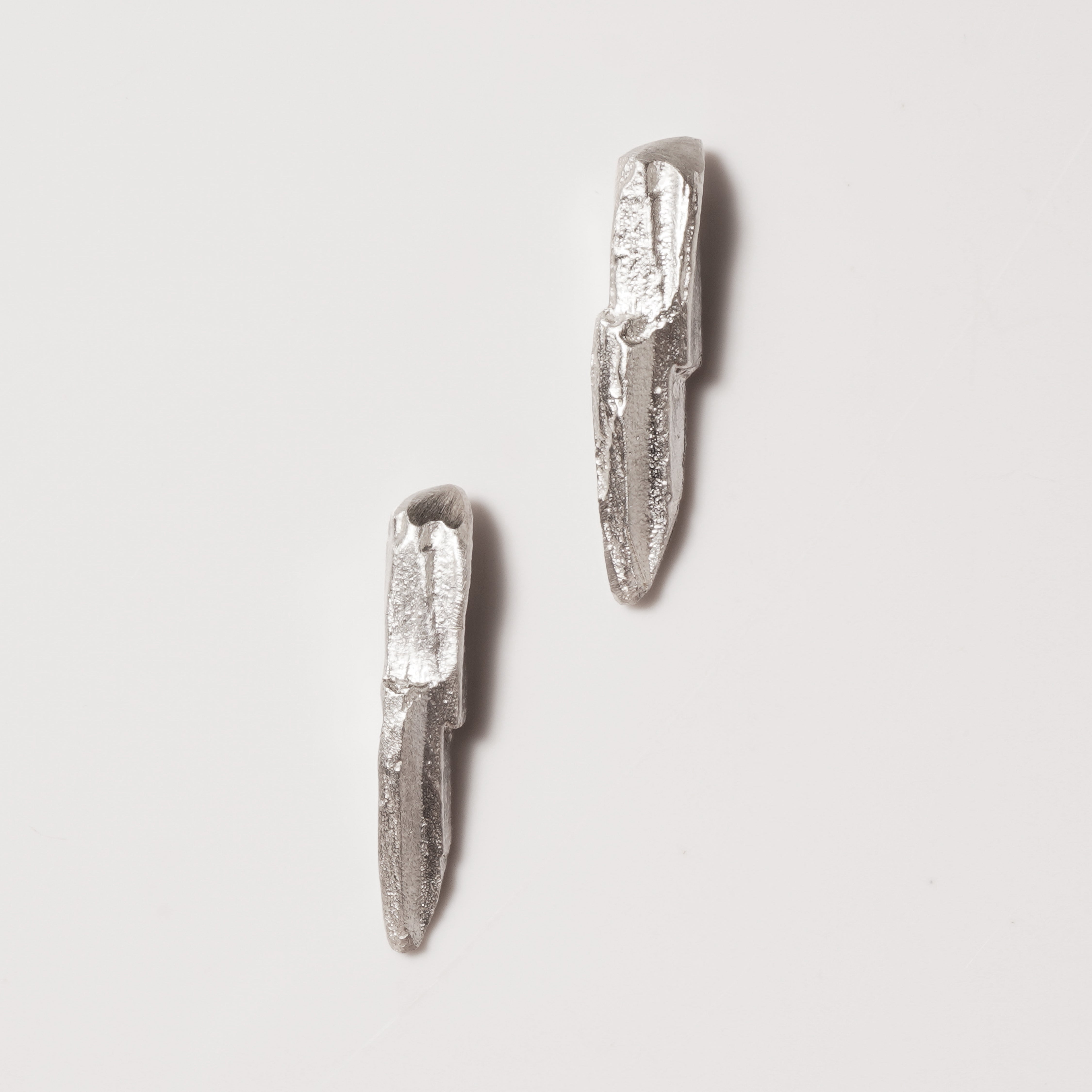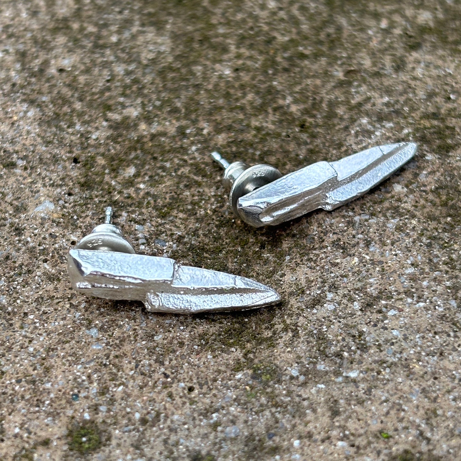 These recycled silver earrings are sand cast from a natural mineral shard, capturing its raw, earthy texture. Each pair carries a little piece of the landscape, transformed into wearable art. Length 20mm.
