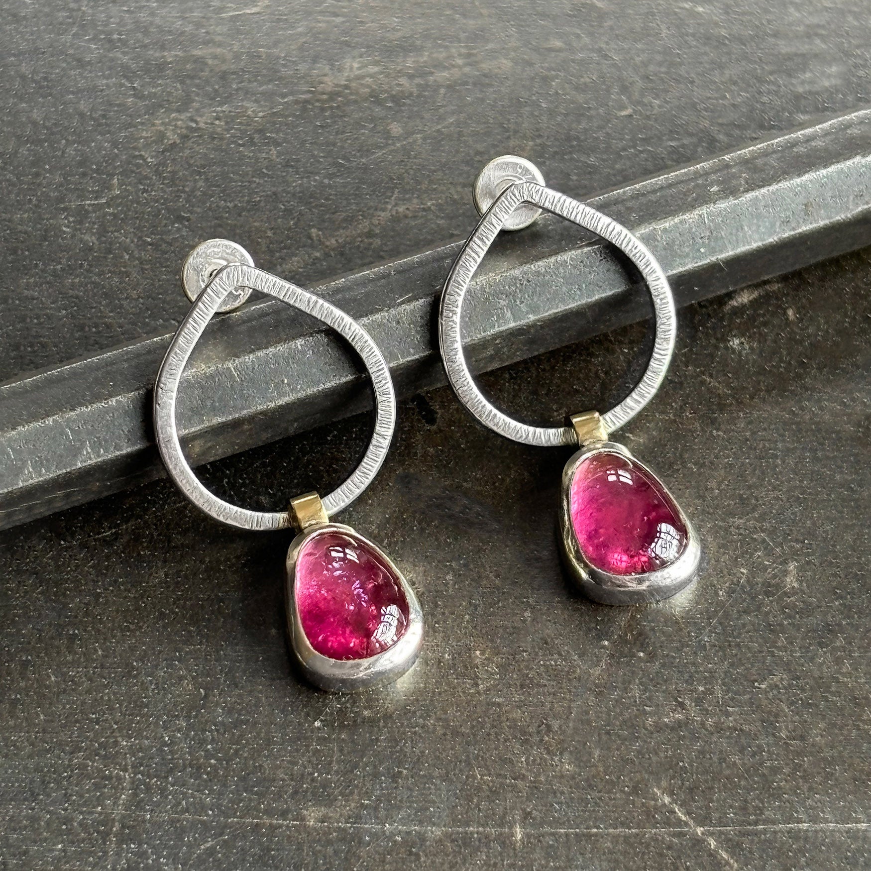 These silver earrings feature rich, gemmy pink tourmalines paired with sterling silver lotus shapes that have been hammer-textured for extra detail. They hang from gold bails, giving a subtle two-tone effect. Each earring measures 32mm x 17mm, making them a perfect size to add a bold pop of colour to your look.