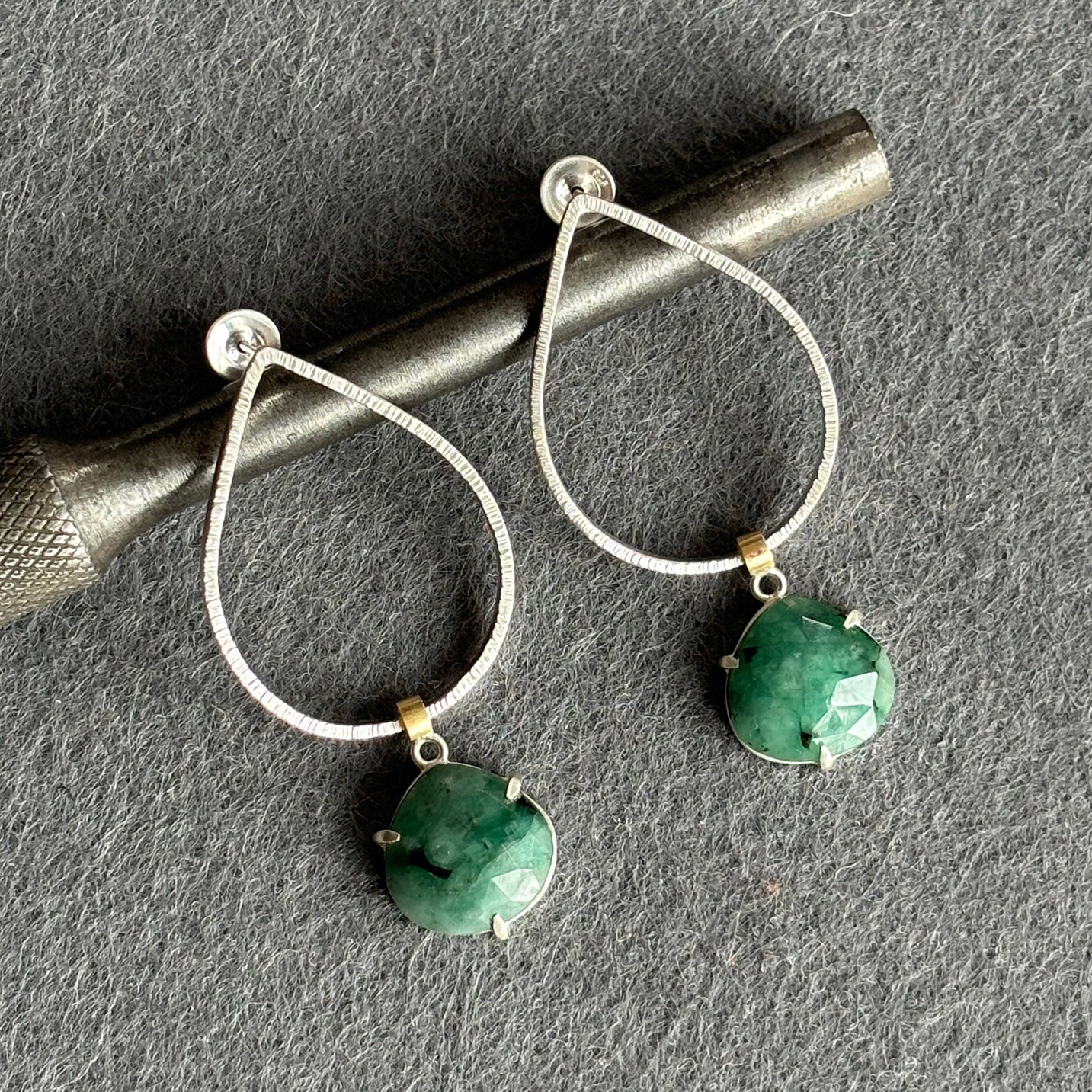 The opaque emeralds are paired with sterling silver lotus shapes, hammer-textured for added detail. The stones drop from a gold bail, creating a subtle two-tone design. A classic touch for any occasion!